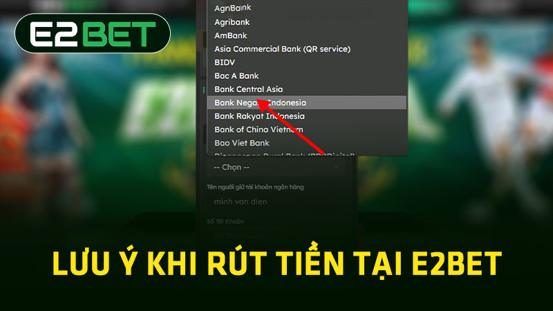 Trước khi thực hiện rút tiền e2bet, hãy đảm bảo rằng thông tin ngân hàng của bạn đã được điền chính xác. Những thông tin này bao gồm số tài khoản ngân hàng, tên chủ tài khoản và ngân hàng liên kết.